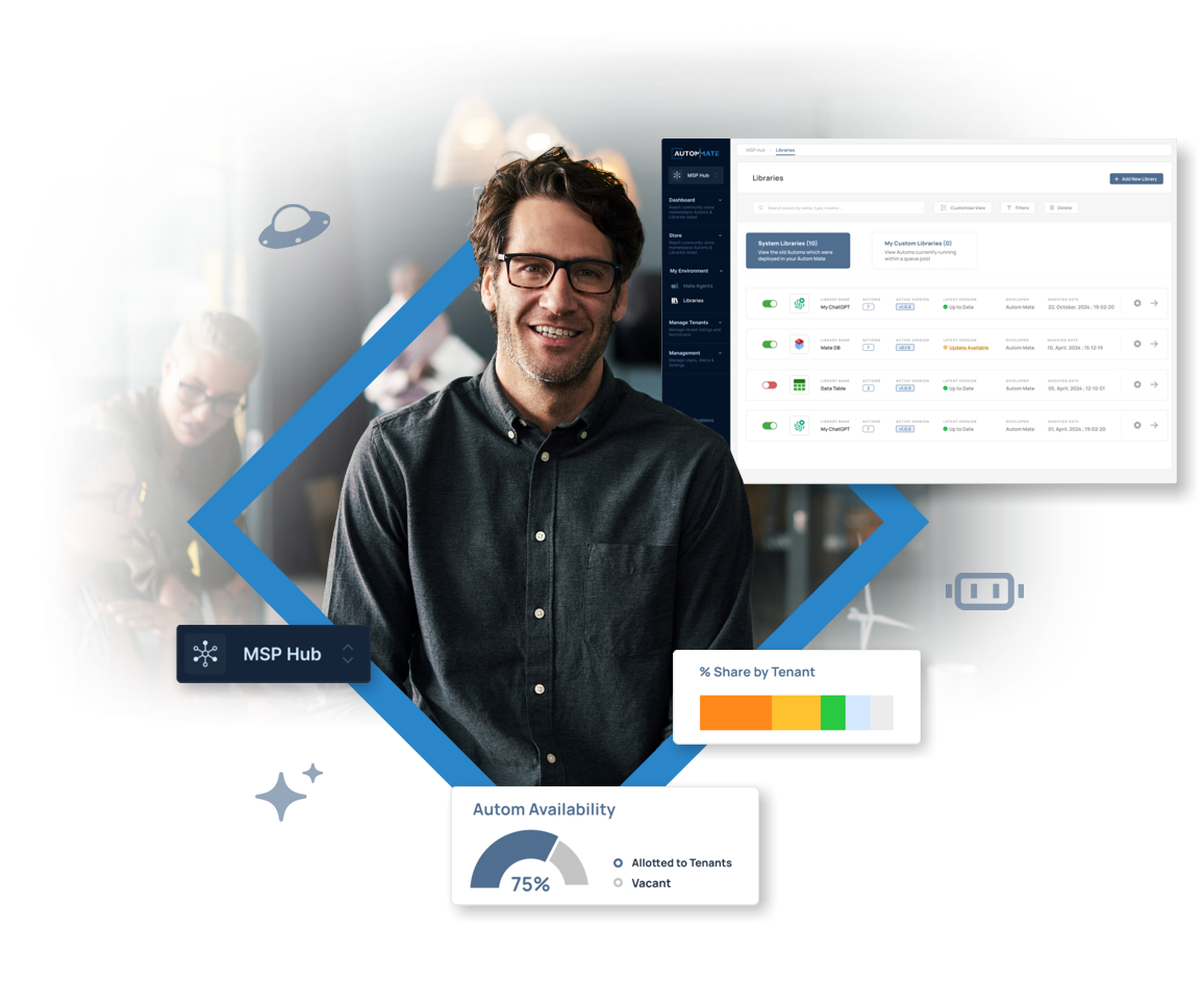 The Autom Mate Service Delivery Platform blends AI Orchestration (Agent Composer) with powerful Hyperflow capabilities (Enterprise Edition) and secure multi-tenancy (MSP Edition).