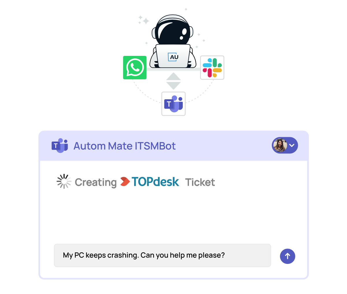 Autom Mate connects Microsoft Teams with leading ITSM platforms like ServiceNow, Jira Service Management, Ivanti, Xurrent and BMC. Users can create, track, and resolve incidents and requests in Teams, while automation speeds resolution, reduces friction, and improves Level-1 service outcomes.